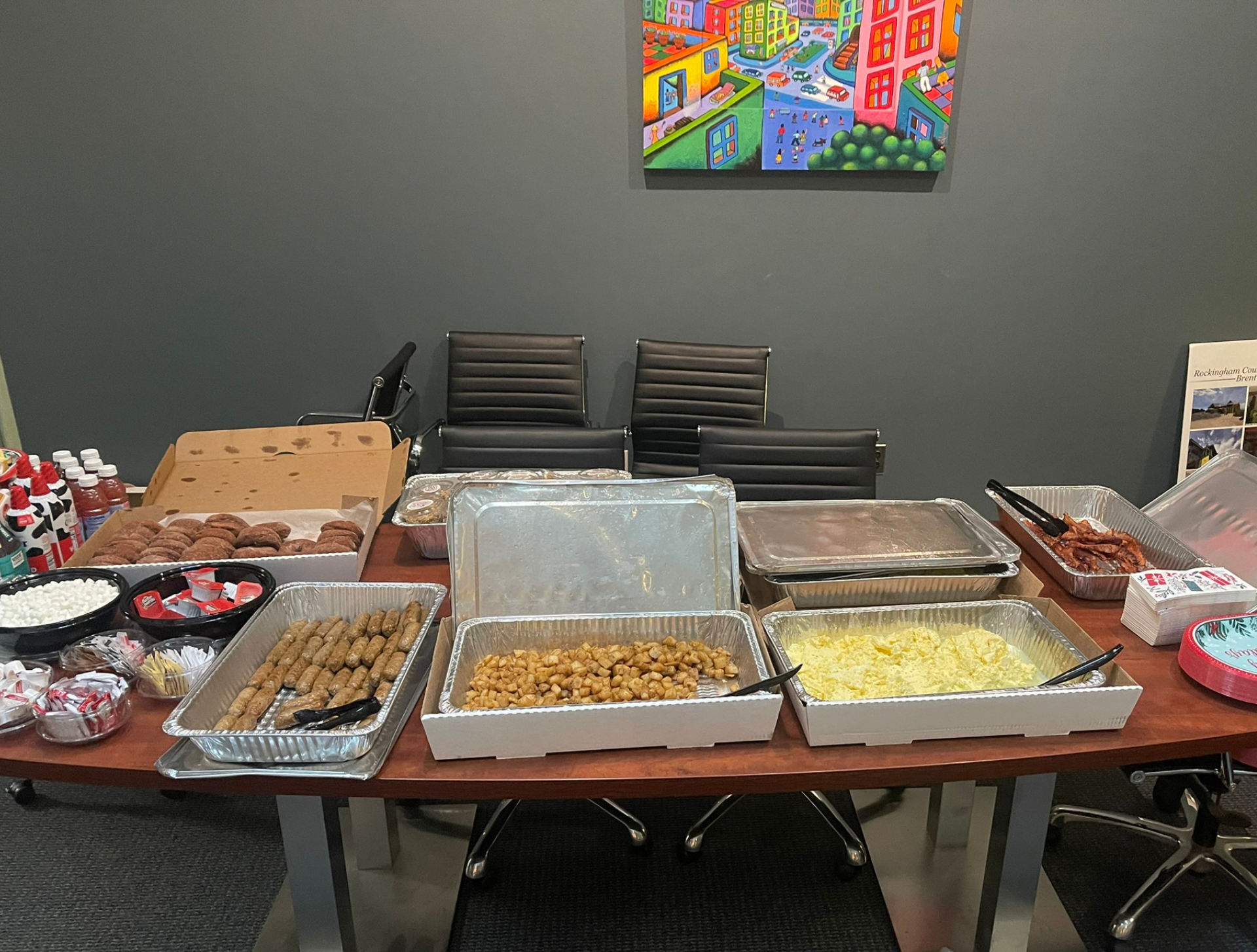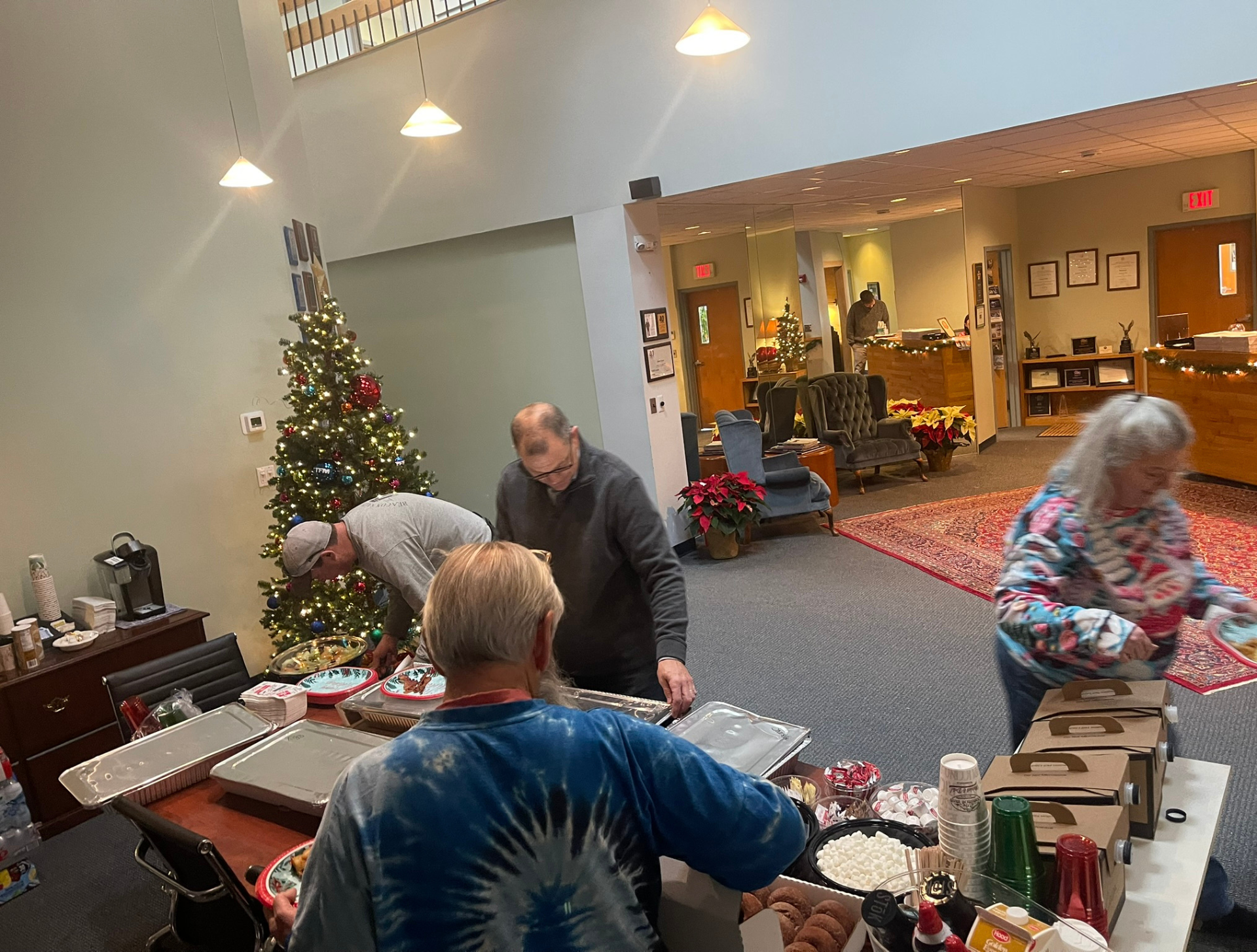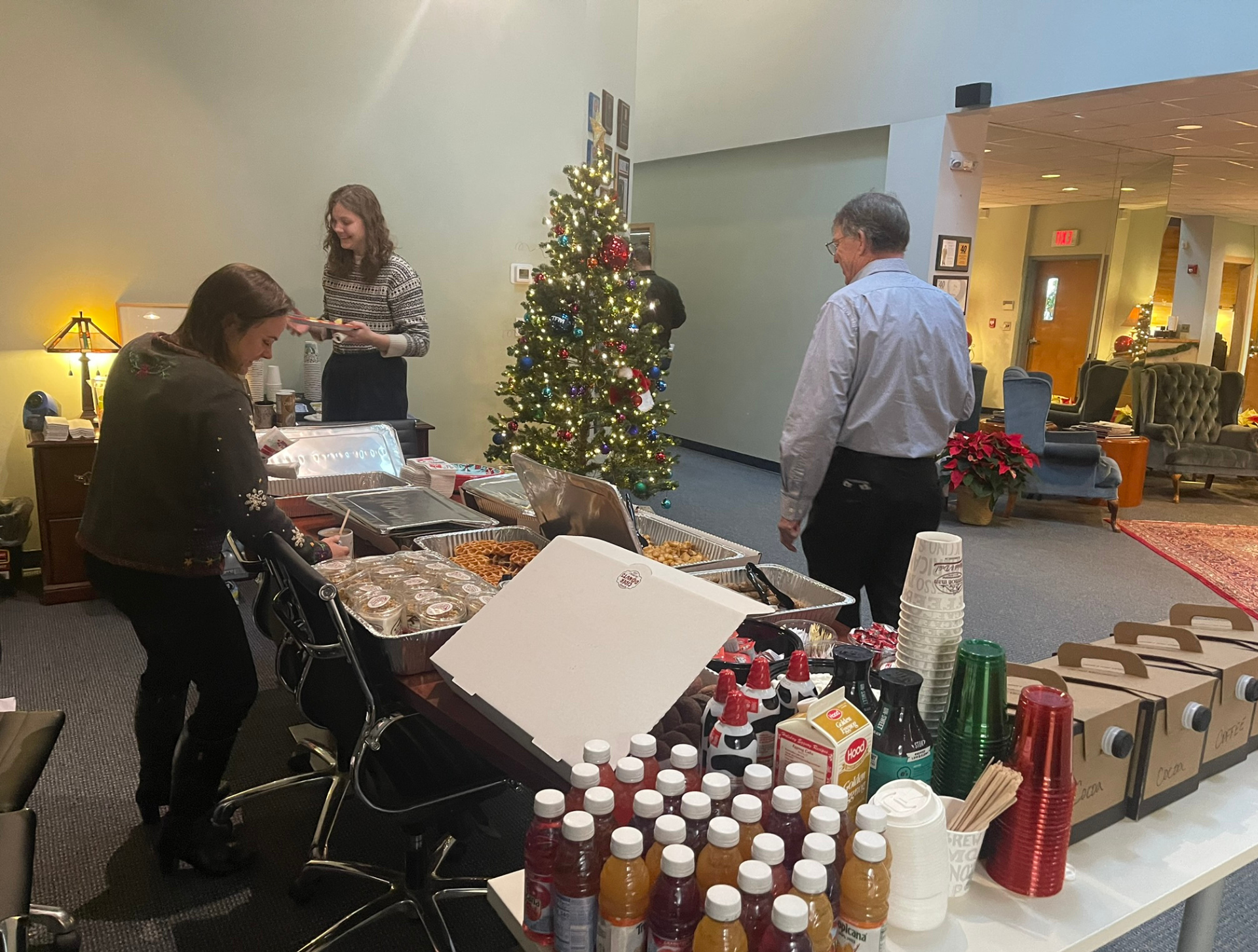 At our Bedford office, the lobby turned into a festive wonderland for our annual Ugly Sweater Breakfast. Nostalgia, laughter, and plenty of holiday spirit filled the space as everyone enjoyed a delicious breakfast spread from The Common Man Roadside—scrambled eggs, bacon, sausage, waffles, hash browns, fruit salad, cider donuts, hot and iced coffee, juices, eggnog, and a cozy hot cocoa bar piled high with marshmallows and whipped cream. It was the perfect way to start the day, with lots of mingling, smiling, and showing off some truly impressive (and impressively ugly) sweaters! And the winners are: